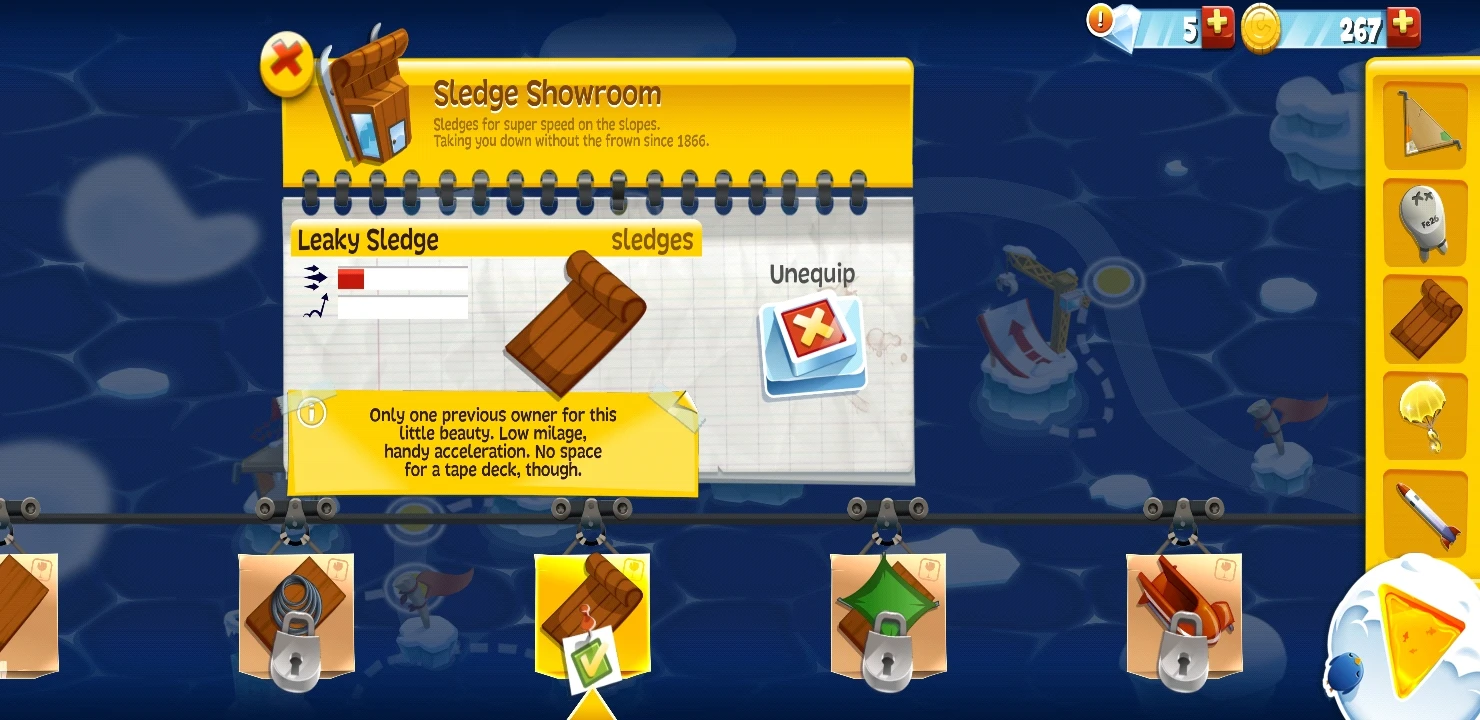 The Leaky Sledge is a sled in Learn 2 Fly Mobile. It costs 900 coins in the Sledge Showroom.