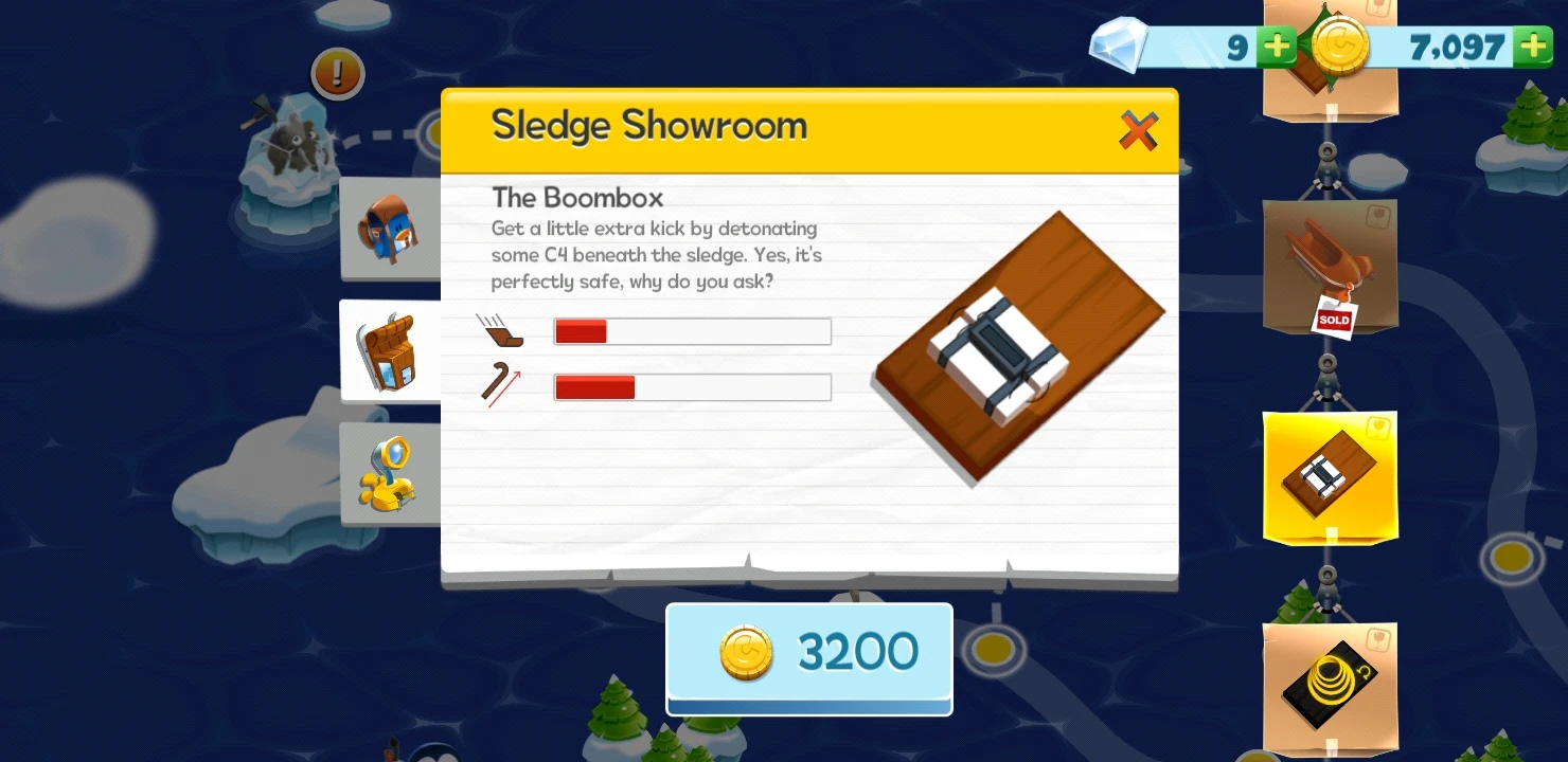 The Boombox is an active sledge in Learn 2 Fly Mobile. It costs 3200 coins at the Sledge Showroom.