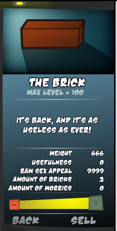 | Level | Weight | Usefulness | Raw Sex Appeal | Amount of Bricks | Amount of Worries |